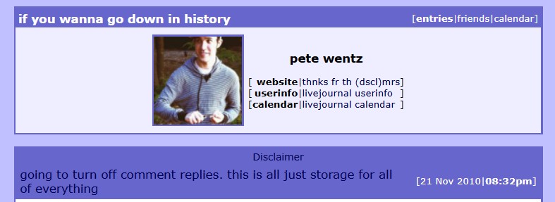 This angsty haiku prose was poetry to a generation. Lost to the march of history internet history now, the shuttering of websites and migrating of users. The flame kept alive by an archive of the most dedicated FOB fans. This style of cryptic, this kind of lyrical blogposting just doesn’t exist anymore. No one reads blogs. There’s no need to when you can open a video camera and start screaming your thoughts to the world instantly. No space or gap to be filled with words in the way there was with MySpace and Livejournal. Statuses and bios, MSN Messenger and PureVolume. This was the language of the 00s, and Wentz was an icon for his words and the way he spilled them forth so freely to his devoted fans. With his uniquely avoidant droll style in his lyrics and blogs he confronted whimsical love, lust and boredom alongside genuine trouble, including his own harrowing suicide-attempt in February of 2005. He really was the person he presented in his lyrics, confused, horny, depressed and often at odds with his own existence.
